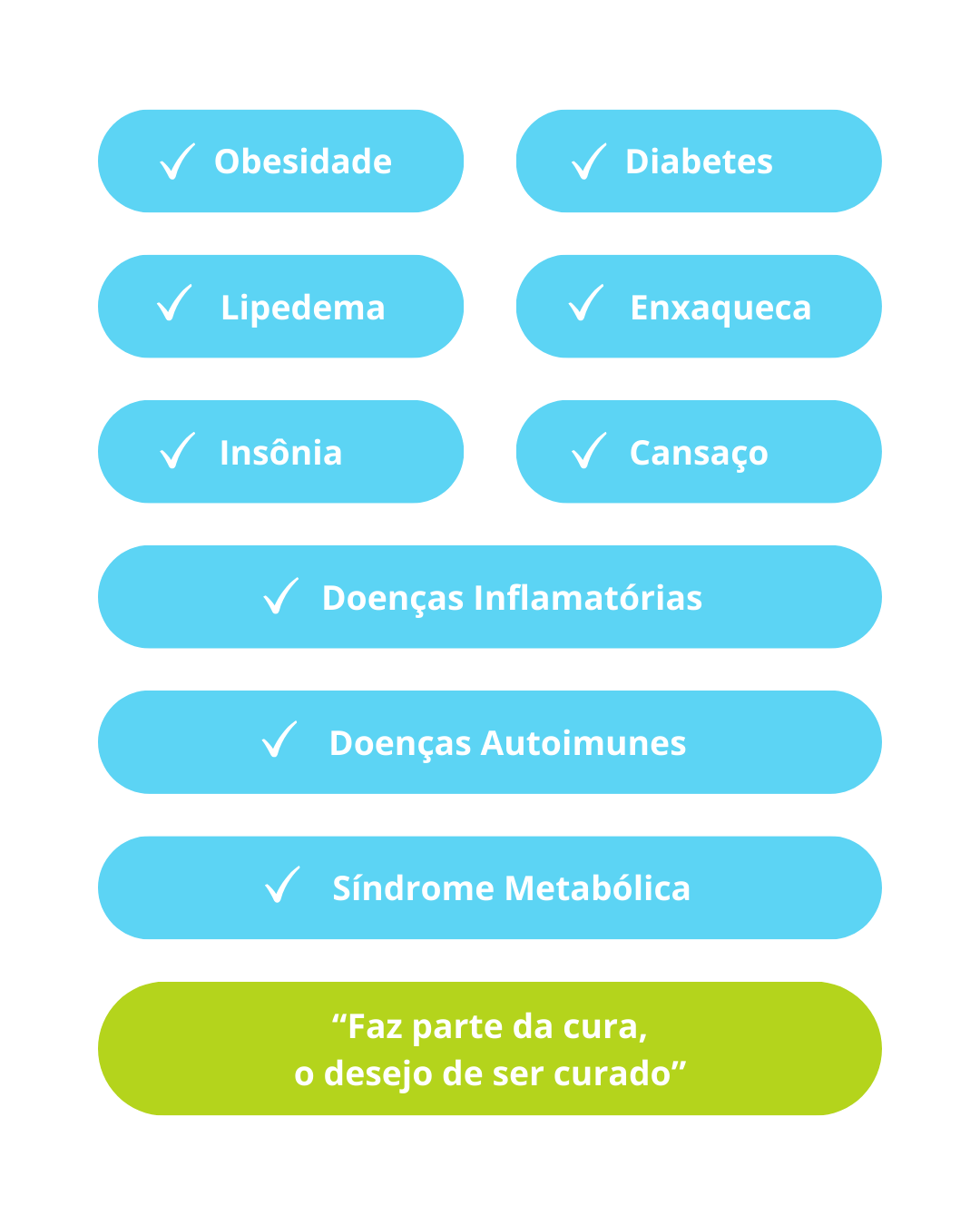 Atuação na Prevenção e Manejo de Doenças Crônicas, Inflamatórias e Autoimunes, melhorando condições como: Insônia, Fadiga, Enxaquecas, Problemas de Pele, Cabelos e Unhas, Problemas Intestinais, dentre outros.