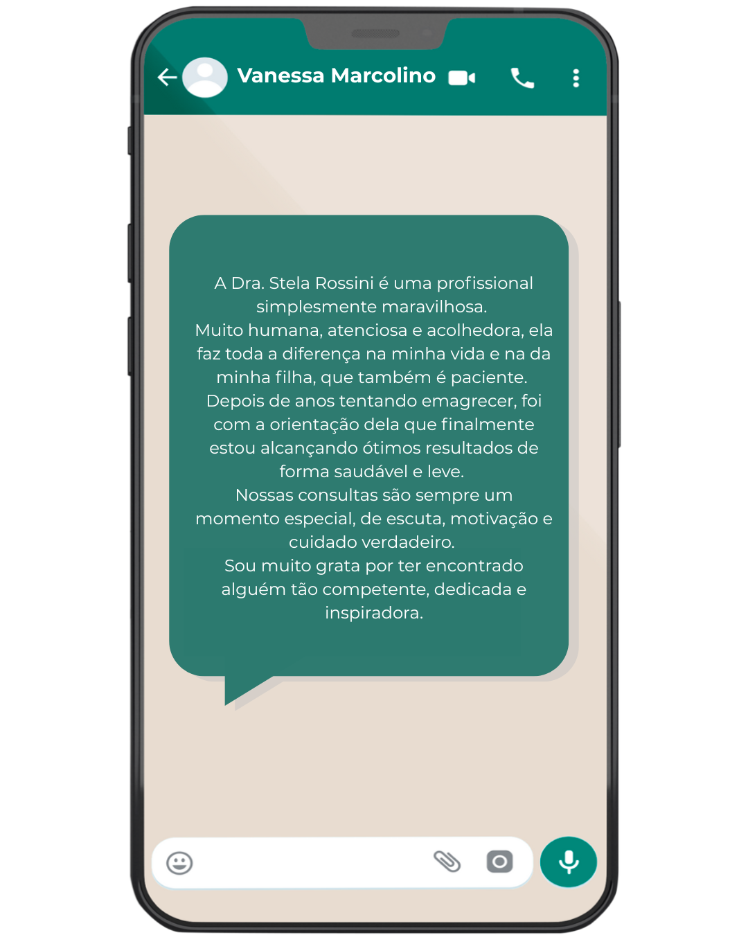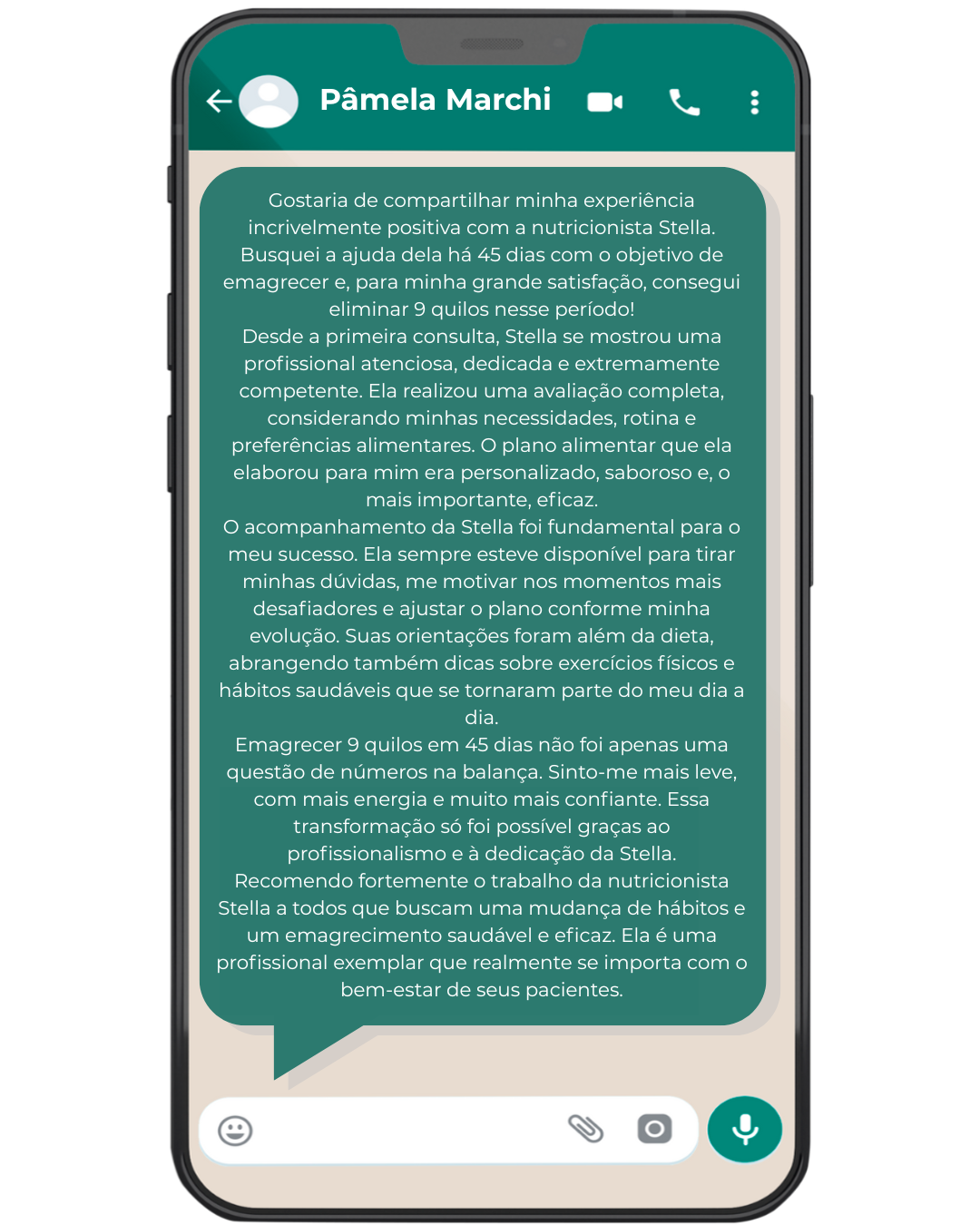 Venho desse depoimento escrever um pouco da mudança que a Stela fez na minha vida! Fui diagnosticada com Lipedema e a partir de então precisaria mudar minha alimentação para desinflamação e emagrecimento, que já vinha lutando há algum tempo. Nunca fui de seguir dietas pois tenho uma seletividade alimentar muito grande. Desde a primeira consulta Stela respeitou meus limites e sempre esteve comigo, me animando, passando receitinhas e me ajudando a enfrentar essa seletividade alimentar incluindo alimentos que antes não conseguia comer! Sendo assim tive uma grande melhora no Lipedema e também na perca de peso. E isso é apenas o começo de muitos resultados que ainda vamos colher. Stela muito obrigada por não desistir de mim e me ajudar a mudar para melhor! Beatriz Cunha 🫶🏻